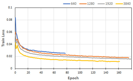 The learning with 640-pixel resolution images had 50% random scaling, which was not applied to the input image size. This was due to image interpolation through resizing at low resolutions being small, which caused uncertain data increases (Table 2).