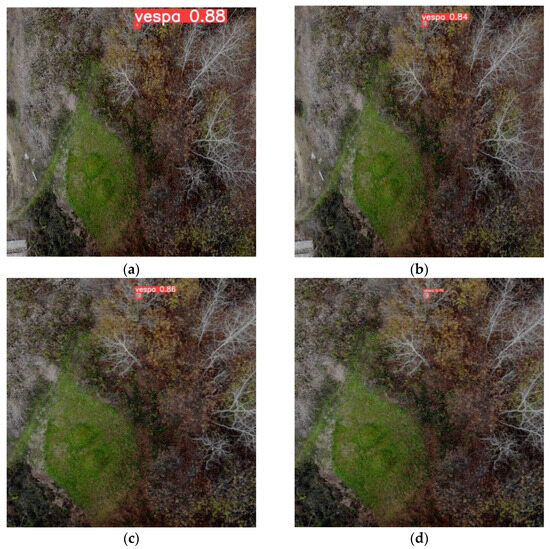 Figure 7. Detection of Vespa velutina nest in the image data. (a) YOLO-v5s-default (640-pixel resolution), (b) YOLO-v5s-1280 (1280-pixel resolution), (c) YOLO-v5s-1920 (1920-pixel resolution), and (d) YOLO-v5s-3840 (3840-pixel resolution).