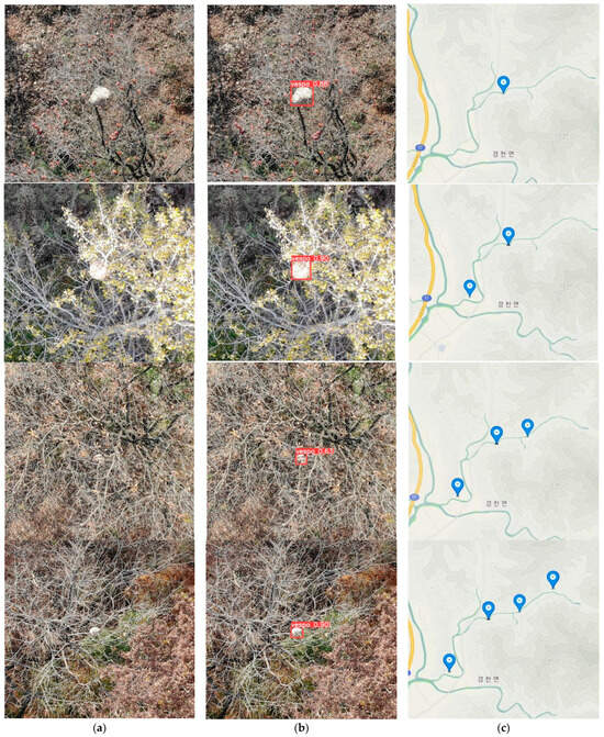 Figure 11. Images of detection and real-time coordinate generation during the demonstration flight. (a) Photo of a V. velutina nest taken by an actual drone in flight. (b) The result of V. velutina nest detection in the analysis unit of the drone during flight. (c) Image that the analysis unit transmits when saving the coordinate information on a DB and simultaneously informing the website (경천면 is Gyeongcheon-myeon).