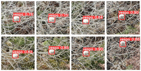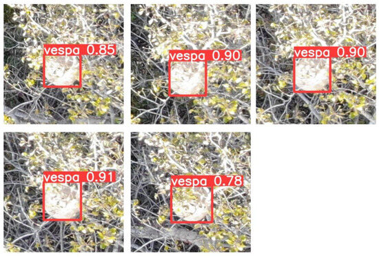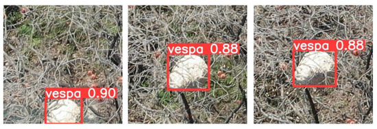 At resolutions of 640, 1280, 1920, and 3840 pixels, the V. velutina nests were detected through each learning model. However, all 229 V. velutina nests in 7158 frames were not detected. The higher the resolution, the lower the number of false detections. YOLO-v5s-3840 trained with the highest resolution images obtained 98% better precision, 89.5% better recall, 7.5% better accuracy, and a 91.7% better F1 score than those of YOLO-v5s-default trained with the lowest resolution images (Table 3). False detections did not consistently decrease with resolution but occurred frequently at low resolutions, and the highest number of false detections was found with 1280-pixel resolution images.