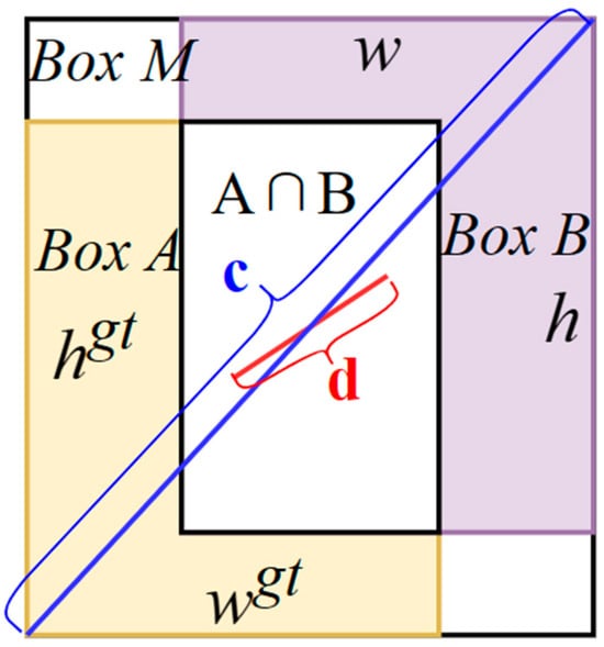 Equation (2) is the locus loss function of the target box, also known as the regression loss, notated as Lbox, which is mainly used as the CIoU loss function [33]. In Figure 3, box A is the real box, box B is the prediction box, and SIoU is the intersection ratio between the real box and the prediction box; box M is the smallest external rectangle containing box A and box B. Where ρ2(A, B) is the Euclidean distance between the centroids of the real box and the predicted box, i.e., the length of d in the diagram; c in Equation (2) is the diagonal length of the smallest outer matrix M that encloses box AB; wgt and hgt are the width and height of box A of the real box, and w and h are the width and height of box B of the predicted box. Compared with the traditional IoU, the CIoU introduces a penalty term v, which can better handle targets with different aspect ratios; it can measure the distance between the predicted box and the real box more accurately and improve the accuracy of target detection for the situation that boxes of different sizes have different overlap when the IoU values are the same, i.e., the problem of scale sensitivity.