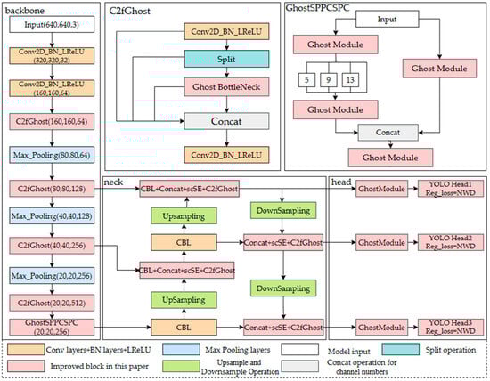 The C2fGhost structure connects features at different levels to achieve multi-scale perception and strengthen the model’s ability to detect targets with medium-scale changes in transmission lines. At the same time, through the residual branch of Ghost BottleNeck, the model can learn richer feature representations and still, the advantages of low complexity and a small amount of calculation of the Ghost module are retained. Then, while retaining the original structure of SPP, the ghost replacement is performed on some convolutions to achieve the purpose of lightweighting the model, which is denoted as GhostSPPCSPC. Finally, the convolution module that is in front of the three different scale detection heads in the head part is replaced by the Ghost module, and the model is further simplified, which is recorded as GhostConv(Head), and the calculation amount and model parameters are significantly reduced.