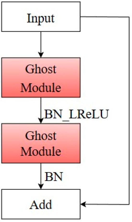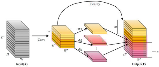 Compared with the unnecessary, redundant feature maps generated in the normal convolution process, the Ghost module uses simple and easy-to-operate linear operations to enhance features and increase channels’ mining information from original features with a small computational cost, which is a lightweight and efficient convolution module. The principle of the Ghost module is shown in Equation (5) [34]: