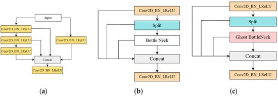 (a) ELAN module structure diagram; (b) C2f module structure diagram; (c) C2fGhost structure diagram.