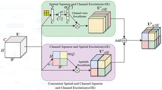 The scSE process principle is shown in Equation (6). The calculation of the scSE attention mechanism consists of two steps, cSE and sSE. In cSE, the input feature map U is transformed into a feature map of 1 × 1 × C after global pooling Z. It is then normalized using a sigmoid function, noted as activations σ (Zi), and these activations are adaptively adjusted to ignore the less important channels and emphasize the important ones, and finally, the calibrated feature map (U’cSE) is obtained by channel-wise multiplication. In the sSE part, U undergoes a 1 × 1 × 1 convolution into a 1 × H × W feature map, with each value σ(qi, j) corresponding to the relative importance of the spatial information (i, j) for a given feature map. This recalibration provides the more important relevant spatial locations and ignores the irrelevant ones. The final output of the two is summed to obtain scSE [35].