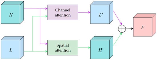 The entire network takes the high-level feature map H and the low-level feature map L as output and fuses the output features of the two branches. In the channel attention branch, high-level feature maps guide low-level features with channel attention masks. The channel attention cSE enhances the network’s feature extraction in transmission lines, leading to a low-level feature map L′ with rich semantic information. In the spatial attention branch, a spatial attention mask guides the high-level feature map using the low-level feature map. The spatial attention module sSE strengthens the capture of spatial information, resulting in a high-level feature map H′ with spatial information. Finally, after the two are fused, a feature quantity containing spatial and channel information is output, and then the deep and shallow features are fused through PA-Net to balance the multi-scale features.