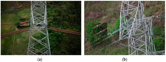 The dataset used in this paper is provided by the State Grid Corporation of China. The dataset records fault images of transmission lines taken by M300-RTK. There are 3824 pictures in total. Each picture contains one or more targets. The target labels include four types of typical faults of transmission lines: Corrosion of insulators, insulator defects, bird’s nests, and anti-vibration hammers, corresponding to ‘Insulator’, ‘Defect’, ‘Nest’, and ‘Fzc_xs’ in the first row of Table 1. At the same time, the number of labels corresponding to each category is shown in the second row of Table 1. LabelImg software is used to label the image, and the dataset is divided by a ratio of 8:1:1 (training set: validation set: test set). The number of categories in each group is higher than that of the standard VOC2017 dataset in the production of the VOC format dataset; therefore, this dataset has the same training ability as the standard dataset in the sample size. Some faults are shown in Figure 1.