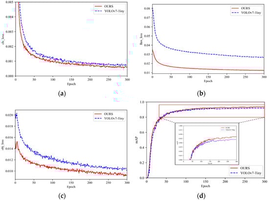 In this paper, the backbone network is significantly modified in the improvement process; therefore, pre-training weights are not applicable. To reduce the likelihood of the model falling into a local optimum, a stochastic gradient descent (SGD) optimizer is used. The training batch was set to 8, and 300 rounds were trained. A cosine annealing learning rate was used, and a decaying learning rate was applied to the bias layer to improve the convergence speed of the model to enhance the diversity of the data with the robustness of the model itself. Figure 12a–c show the three loss curves before and after the model’s improvement. It can be seen that the improved model has improved compared to the original model, especially in Figure 12b. For the dataset containing more small targets in this paper, the improvement of the localization loss effect after replacing the NWD is particularly obvious. From Figure 12d, it can be seen that the improved model has a significant improvement in mAP, which verifies the feasibility of the improved algorithm in this paper.