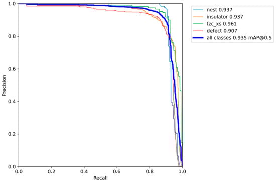 In Equations (10)–(13): TP, FP, and FN represent the number of correct detections, false detections, and missed detections; AP is the integral of the P–R curve; and N is the detection category. Figure 13 is the mAP curve drawn by the improved algorithm in this paper.