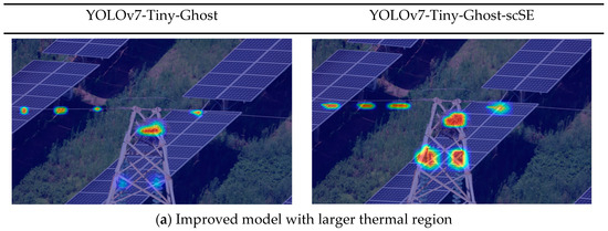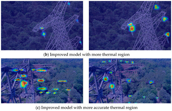 To further verify its effectiveness, this paper visualizes the Grad-CAM heat map for the following typical situations, and the test results are shown in Figure 14. It can be seen in Figure 14 that in Figure 14a,b, the thermal region of the improved model is enlarged, which means that the model assigns more weights to the targets to be detected, and the darker the color, the more weights are allocated. Figure 14c shows that the model before the improvement assigns incorrect weights to areas with no detection target. Although the improved model has fewer thermal areas than before, it accurately identifies the thermal area.