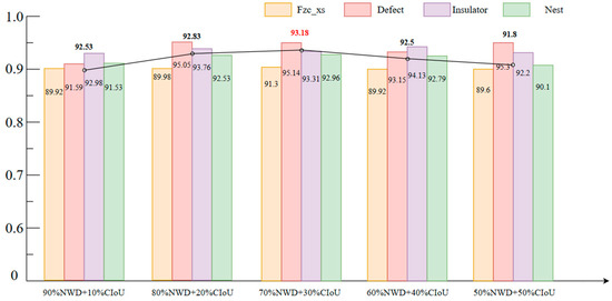 In this paper, CIou is replaced with an NWD loss function with better detection accuracy for small targets, and the training time is found to increase substantially after training. Then, an improvement strategy of mixing different proportions of NWD with CIoU is proposed to retain the accuracy of NWD while speeding up the training time. Finally, the models with loss functions fused in different proportions are retrained and tested on a typical fault dataset of transmission lines. The proportion of NWD loss functions in the experiments was set to 100%, 90%, 80%, 70%, and 60%, respectively, and the model performance for different fusion proportions is shown in Table 4. The 90% NWD + 10% CIoU in the table is the localization loss function consisting of 90% of the NWD loss function and 10% of the CIoU loss function together, and the others are similar.