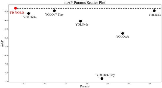 It can be seen in Table 5 that the accuracy and speed of the second-stage algorithm Faster R-CNN have a significant gap compared with the first-stage algorithm YOLO series, especially for tiny target anti-vibration hammer corrosion, with only a 55.72% mAP. From the algorithm extension of YOLOv4 to YOLOv4-Tiny, the YOLO series algorithms are developing towards becoming lightweight. In the table, YOLOv5s, YOLOXs, YOLOv6s, YOLOv7-Tiny, and YOLOv8n are all their corresponding lightweight versions, and the accuracy is gradually increasing. For the model, the number of parameters gradually decreases; TD-YOLO compares with the original algorithm, mAP is improved by 0.71%, and the number of model parameters is reduced by 74.8%. Further, we analyzed the position of the improved algorithm in the current mainstream lightweight algorithm and drew the data as a parameter-precision floating-point diagram, as shown in Figure 16. It can be seen from the verification results on the transmission line fault detection data that the performance of TD-YOLO is in a leading position compared with the other YOLO series lightweight algorithms in various indicators.