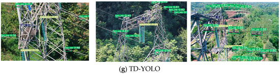To further verify the advantages of the proposed algorithm, three representative scenarios are selected to verify the model, namely, target faults under shadow occlusion, multi-scale target faults, and multiple small target faults [41,42]. In the experiment, it was compared with Faster R-CNN, the mainstream lightweight algorithm in Table 6, and our TD-YOLO algorithm. The detection results are shown in Figure 17.