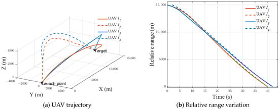 The simulation results are shown in Figure 10 and Table 4. It can be observed that all the UAVs have successfully reached the target position. The impact time errors for UAVs and are both within , while the impact angle errors are both within . Obviously, compared with UAVs and , UAVs and achieve better accuracy in both impact time and impact angle. This is because the guidance method in [14] adopts a linear estimation method to calculate the time-to-go, which would degenerate under nonlinear kinematics.