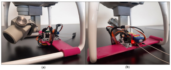 Payload system attached to a DJI® Phantom 4 RTK. View from left (a) and view from behind (b).
