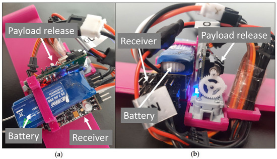 Close up image of the release system with emergency release mechanism, power supply and receiver. View from above (a) and view from behind (b).