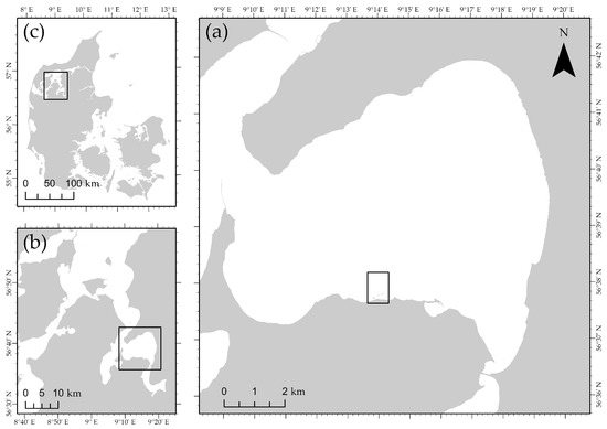 Study area (a) situated along the southern coast of Lovns Broad in Limfjorden (b), Denmark (c).