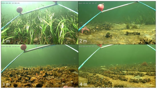 The broad is an important fishing ground for blue mussel fisheries [41] and is subject to high nutrient loads, highly organic sediments and low light conditions. As a designated Natura 2000 habitat, the area has been extensively monitored since 2009. Vessel-based video transect campaigns have been conducted triennially as part of an environmental impact assessment (EIA’s) of the blue mussel fisheries, which has created a robust record of the broad’s benthic habitats [42]. The depth range in the study area was expected to be between 0 and 4 m. Video transects conducted at each 1-m depth interval in the study area in May 2022 recorded dense beds of the seagrass species Zostera marina on the sandy bottom at a depth of 1 m. A mixed environment of Z. marina patches, mussel patches (Mytilus edulis) and sand was recorded at 2 m depth, while only a few single Z. marina shoots were recorded at 3 m depth, which were sparsely distributed between agglomerations of M. edulis shells. At a 4 m depth, no Z. marina was recorded. Instead, dense beds of M. edulis dominated the sea floor. Figure 5 illustrates the benthic habitats at each 1-m depth interval, based on video recordings obtained in May 2022 as a part of an EIA for the area.