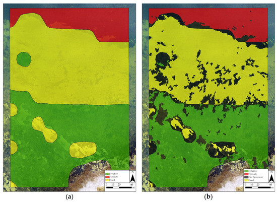 On occasion, environmental conditions above and/or below the water surface did not allow us to obtain UAV-based aerial imagery of submerged habitats of good enough quality needed to create an orthomosaic that covers the whole study area, i.e., preventing us from performing a classification based on UAV-derived aerial imagery. A solution for such “worst case” scenarios was tested by interpolating the 136 georeferenced and labeled point observations obtained with the payload device using the spline interpolation method. The interpolation could only be performed over 5.1 ha of the total 7 ha large study site due to the limitation of the method to the outer edges of the sampling grid. From the 5.1 ha, 2.1 ha were classified as seagrass, 2.4 ha as sand and 0.6 ha as mussels. A comparison of both classification methods, i.e., the interpolation of point observation and the classification based on OBIA (Section 4.1), showed an agreement of 85.7%. Assuming that the classification output of the OBIA is the one closest to the actual class distribution in the study area, most misclassification of the interpolation method occurred along the class borders and in regions with patchy class distribution when the interpolation method was used. Figure 10 illustrates the output of the interpolation methods, as well as a comparison of both methods.