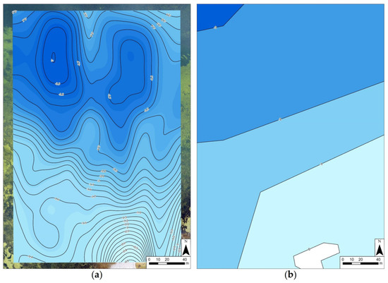 The depth measurements collected by the payload system (Figure 8) could be interpolated to a detailed bathymetry map of the study area using the spline interpolation method (Figure 11a).
