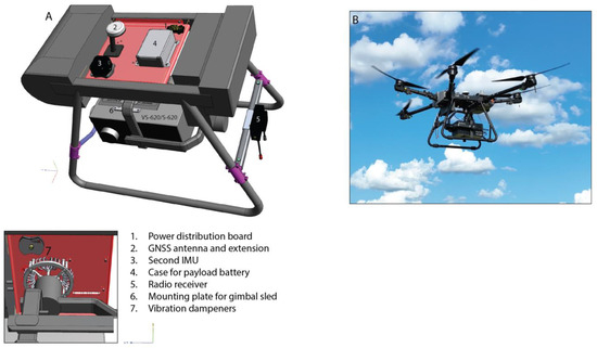 (A) CAD drawing illustrating the integration of the various components with the T30 as described in Table 3. The inset shows the underside of the plate with the gimbal connected to the vibration isolator. RPAS arms and propellers are not shown for clarity. (B) Final RPAS HSI integration during data collection at Mer Bleue.
