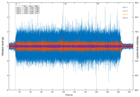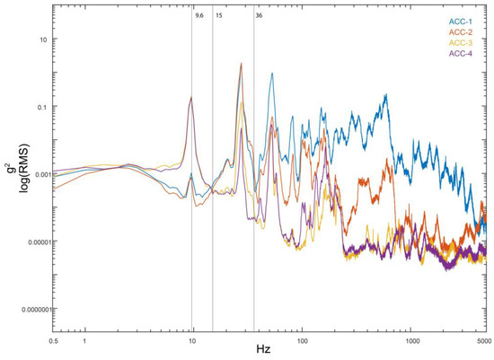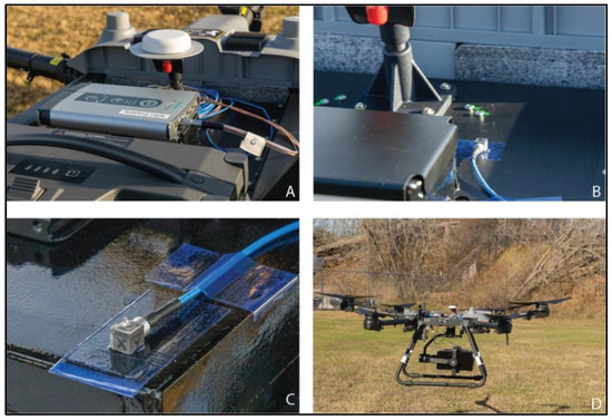 A vibration test was performed to evaluate the effectiveness of the vibration dampener and gimbal to reduce vibration transmission from the RPAS to the payload. For this test, we utilized a replica of the S-620. Given the similarities between the VS-620 and S-620 (dimensions and weight), we were confident that our evaluation applies to both sensors. A total of four locations (i.e., top platform, gimbal arm below the vibration plate and two corners of the sensor replica) were selected to characterize the vibration transmission path from the RPAS platform to the payload. A PCB356A01 ICP-type tri-axial accelerometer was used for each location. The weight of the sensor was 1 g, and had a nominal sensitivity of 5 mV/g in each direction. The four sensors were glued to the surfaces using LOCTITE adhesive. A battery-powered light-weight Siemens SCADAS XS data acquisition device was attached to the T30 platform to record the data from the sensors. The data sampling rate was 12.8 kHz. The setup is shown in Figure 3. The test involved the rotors spinning on the ground, taking off to 1 m AGL, hovering in place for 3 min and then descending to land. The time domain and spectral analysis were performed using the Siemens Testlab R18 version software, an ISO certified software for signal analysis. The power spectral density plots were generated with a frequency resolution of 0.5 Hz, energy-averaged, amplitude rms-scaled, using MATLAB.