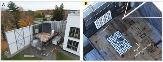 (A) Overview of the wind tunnel exit with the raised platform. (B) Closeup of the T30 hovering over the marked grids. The wind tunnel flow moves right to left exhausting the exit plane (x-direction). The streamwise component of the flow is oriented in the x-direction, with the cross-plane v- and w-components oriented in the y- (perpendicular to the flow) and z-direction (vertical component perpendicular to the flow), respectively.