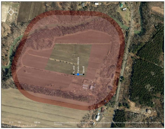 Flight line and the 500 ft and 428 ft (100 ft + maximum altitude buffer) controlled ground buffers at the Rigaud test site, Quebec.