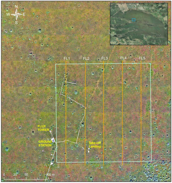 Map of the flight lines at Mer Bleue used to acquire HSI over the 2 ha polygon in support of satellite cal/val activities. Blue square in the inset shows the study area.