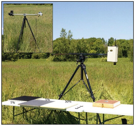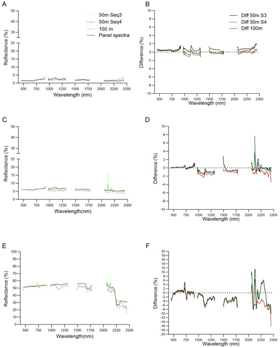 Two data collections were carried out to test the integration of the HSI with the T30 (Figure 2B), one at Rigaud (Figure 5) and one at Mer Bleue (Figure 6). At Rigaud, we collected HSI over known nominal reflectance targets (1%, 5% and 50%) (Figure 5), following cal/val best practices (e.g., [9]) (Figure 7). These data were collected at two different altitudes and speeds, which were predefined using the manufacturer’s planning tool and simulation tool developed in [33], aiming to generate raw pixels with the aspect ratios across a range of point spread function and over/under sampling factors. To assess spectral variability, we collected two separate flight lines at 50 m AGL and 3 m/s (frame time 5 ms, integration time 4.8 ms (VNIR) and 10 ms and 9.6 ms, respectively, for the SWIR). To compare the effect of speed on pixel aspect ratio and the resulting reflectance, we collected one flight line at 100 m AGL at 1 m/s. For each flight line, the reflectance targets were measured with an SVC spectrometer prior to the HSI data acquisition, using the panel substitution method described in [34]. The results from these flights informed the operational acquisition parameters for Mer Bleue (i.e., 100 m AGL at 3.7 m/s). At Mer Bleue, we carried out a performance test of the integrated system with the goal of supporting satellite validation by defining a 2-ha area, representing 5 × 5 pixels for EnMAP and 15 × 15 pixels for Sentinel-2. A local base station was set up on site (i.e., Emlid Reach RS2) with an incoming NTRIP correction from Smartnet North America (11.3 km baseline for the NTRIP correction).