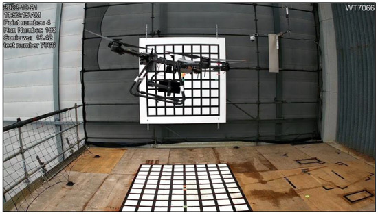 A wind tunnel test was carried out at the National Research Council of Canada’s 3 m × 6 m wind tunnel in Ottawa, Canada. The open loop facility includes an outdoor testing area where the 6 m × 6 m exit flow is utilized for testing RPASs under free-flying conditions. The purpose of the wind tunnel test was to assess potential changes in the aerodynamic performance of the T30 (i.e., smaller surface for wind resistance) due to the replacement of the liquid tank with the gimbal and HSI. In order to determine whether the sustained wind tolerance (SWT), which is the maximum atmospheric wind speed at which the RPAS is safe to fly, of 8 m/s stated by the manufacturer (Table 1) remained applicable, a hover test was carried out.