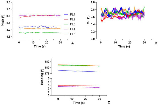 The T30 was operated in GNSS mode without RTK due to the large metallic structure of the wind tunnel obscuring a clear view of the sky (Figure 4), i.e., with a hovering horizontal accuracy of ±0.6 m vertical accuracy of ±0.3 m). The replica Mjolnir S-620 on the gimbal was included in the T30 test configuration. The RPAS was manually flown up to the test platform and placed into a forward-facing hover in the center of the marked grids. Once at the test location, the pilot allowed the autopilot to maintain its position. The wind tunnel was turned on, and the hovering performance of the T30 was recorded by video over a course of 16 increments of wind speed from 5 m/s to 14 m/s with each increment of the autopilot hover lasting 30 s (Table 4). The test was terminated at 14 m/s (50 km/h) because such conditions are not considered to produce high-quality HSI data, especially over vegetated targets, and data would not be collected in those conditions. The wind speed data were first processed by converting it from the wind tunnel native format into MATLAB time-series data from each 30 s test, which was then processed to determine mean wind speed and turbulence intensity.