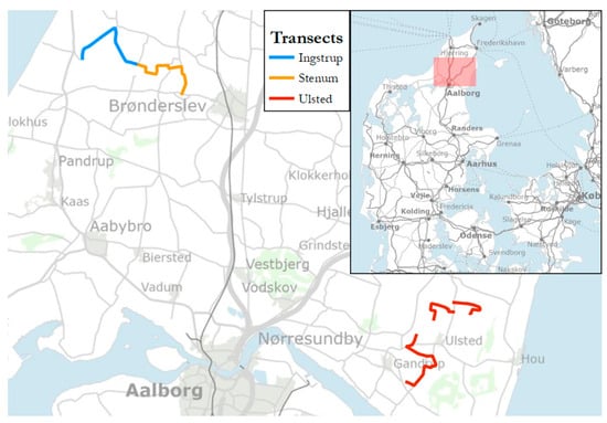 The transect spotlight counts were conducted in Northern Jutland, Denmark, in spring 2023, by volunteer hunters from three census guilds: Ulsted, comprised of a northern and a southern area, (57.07575 N, 10.25559 E), Ingstrup, and Stenum (57.30722 N, 9.80053 E) (Figure 1). The observers had previous experience in spotlight counting and were supervised by the Danish hunter´s association, as part of their annual surveys [7].