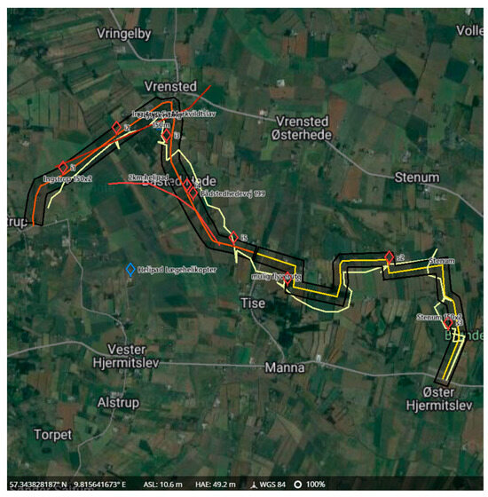 The flight altitude of 120 m above ground level (AGL) was maintained throughout the survey, except for the three times when battery change was needed. This altitude could be kept due to the high-powered TIR zoom capabilities of the H20N. With the use of DJI FlightHub, integrated in the M300 flight system and developed for search and rescue (SAR) missions [41], the manual flight could be preplanned and drawn on the map shown on the controllers, as well as online in a browser. This made it possible to highlight restricted areas and obstacles like power lines and wind turbines (red line, Figure 2) and possible take-off and landing sites (red diamond, Figure 2) and to see the annotations live on the controller. Lines for the safest path when flying manually (light yellow line, Figure 2) were drawn in advance, as a guide to maintain proper distance to residential areas, where the minimum distance was 150 m with a C3-drone like DJI Matrice 300 (>4 kg total weight) [42].