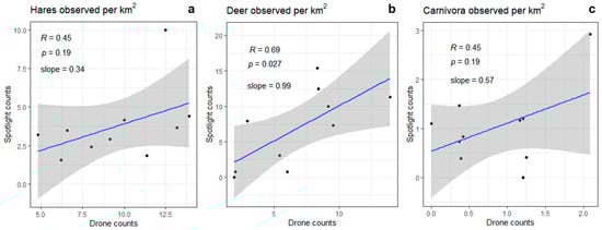 (a–c) Pearson’s correlation coefficient (R), the corresponding p-value (p), and the slope of the linear regression of the number of observations per km2 grouped into hare, deer, and carnivores at the ten surveys.