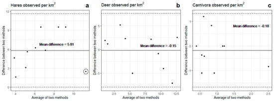 The Bland–Altman plots likewise showed a higher detection of hares by drone than by spotlight counts (Figure 4). On average (solid line), the drone spotted 5.2 more hares per km2 than the spotlight counts (Figure 4a–c). However, as interpreted from the Bland–Altman plot for hares (Figure 4a), except from one outlier, the difference in this average will depend on the density of hares; the difference between the two methods increased with the increased density of hares (the average of the two methods). On average, no difference was found between the drone and spotlight counts for deer or carnivores; the plots were evenly distributed around zero with means of −0.15 and −0.18, respectively, (Figure 4b,c). For deer, the difference between the two methods was ±7 individuals per km2 (Figure 3b), and for carnivores −1.6 to 1.2 individuals per km2 (Figure 4c). No density-dependent difference was found between the two methods for deer or carnivores.