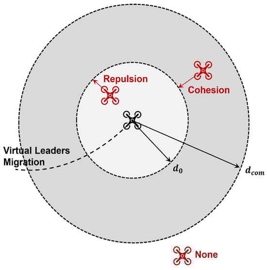 In addition to reinforcement learning, we also introduce a virtual leader. The multi-robot control often uses the virtual leader approach due to its high robustness [19,20,21]. Olfati-Saber [22] has significantly contributed to advancing scalable flocking algorithms via a comprehensive theoretical and computational framework. Within this framework, there are three distinct flocking algorithms. The first algorithm adheres to the three fundamental rules outlined by Reynolds, while the third algorithm incorporates obstacle avoidance capabilities. Central to this framework is the second algorithm, designed as the primary flocking mechanism for agents navigating open space. In this second algorithm, the objective is to ensure that the agent group seamlessly follows the trajectory of a virtual leader. Therefore, a sophisticated navigational feedback mechanism is integrated into each agent. Crucially, it is presupposed that every agent within the group possesses information about the virtual leader, thereby qualifying as an informed agent. This assumption is pivotal, ensuring the entire group maintains cohesiveness and converges to the same velocity. The agent responds to the virtual leader like its actual neighbors. Its purpose is to introduce the task of directing, gathering, or manipulating the behavior of agents.