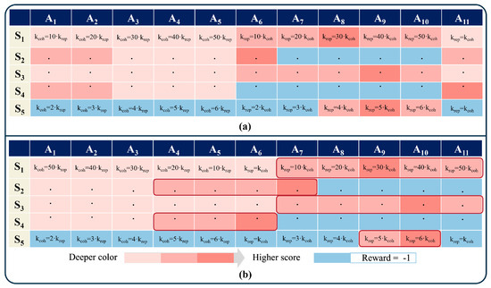 To facilitate the learning process and decision making of the agents, we employ a Q-table as a critical component of our methodology. The Q-table, as illustrated in Figure 3a, serves as a tabular representation of the state–action pairs and their corresponding Q-values. It enables the agents to make informed decisions based on the accumulated knowledge and experiences gained during the learning process.