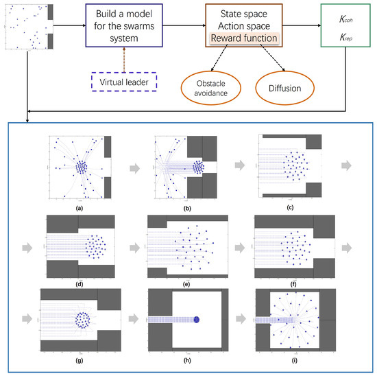 Framework of RL-Boids. In the above part of the algorithm described the workflow, the following part of the simulation results. The dots in (a–i) represent drones. (b,d,f,h) show the virtual leader moving the drone forward through traction. (a,c,g) show the contraction of the drone swarms. (e,i) show the expansion of drone swarms.