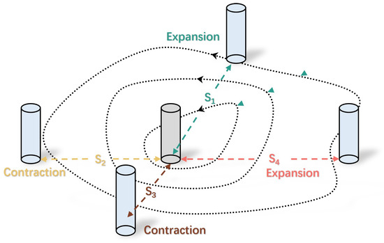 In the simulation, the dynamics of the agents are reproduced in discrete time. Let be the position, velocity, and control inputs of the i- agent at the moment k = , respectively. We can simplify the model appropriately based on the rules of repulsion and cohesion. At this point, the agents in the swarm can be forced to converge to different points and produce the expansion and contraction of the formation by altering the cohesion and repulsion algorithmic parameters. Set the communication distance among the agents as and the boundary distance where repulsion and cohesion occur as . Set the cohesive parameter as and the repulsive parameter as . When the distance , cohesion occurs between agent i and neighbor j. The effect of neighbor j on the velocity of agent i can be expressed as