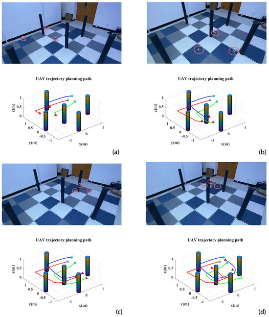 Simulation and indoor real-world experiments for expansion and contraction scalability. (a,d) are composed of real-world experiments and simulations. The part circled in red in the top half is the drone, and the following is the simulation experiment of its current state. (a,d) show the contraction of the drone swarm. (b,c) show the expansion of drone swarms. The experimental video link is as follows: https://www.bilibili.com/video/BV1YN411H7K6 (accessed on 20 September 2023).