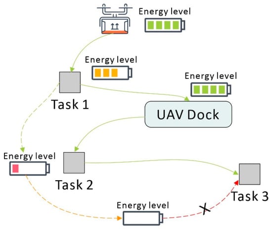 Urban UAV logistics is a complex system involving the interaction of multiple entities, including UAVs, distribution centers (DC), UAV docks, and task locations. In this paper, we mainly considered how to assign multiple tasks to UAVs to minimize energy consumption when UAVs have limited energy and UAV docks are available. As shown in Figure 1, although the energy of the UAV could meet the needs of tasks 1 and 2, it could not perform task 3. Therefore, the UAV should replace the battery at the dock after performing task 1 to reach the energy requirement for performing three tasks. Unlike the traditional allocation method, the consumption of UAV energy affects the task allocation process.