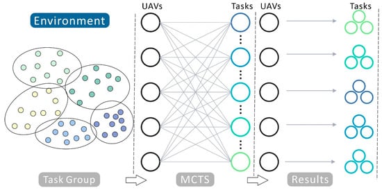 With the continuous advancement of UAV technology and the increasing complexity of task allocation scenarios, the methods above have certain limitations when dealing with MRTA problems with various constraints. To address these challenges, some new approaches offer better solutions for MRTA problems, such as the Monte Carlo Tree Search (MCTS). MCTS was initially mainly used to improve computer performance in board games, especially in Go [43]. AlphaGo, developed by Google DeepMind, employed MCTS as its key component [44]. Moreover, MCTS has gradually been applied to broader domains. For instance, in ever-changing factory environments, MCTS can facilitate rapid automated decisions for human–machine collaboration [45]. Based on MCTS, signal control systems at intersections can be optimized, providing an effective solution for urban traffic management [46]. In autonomous driving technology, by combining reinforcement learning with MCTS, the unsafe behaviors of self-driving vehicles can be minimized, enhancing their performance in intricate settings [47]. In UAV-aided wireless systems, UAV planning problems are addressed using the random-MCTS (R-MCTS) strategy [48]. Furthermore, the greedy-MCTS (G-MCTS) strategy and a combined approach of the random–greedy simulation strategy (random–greedy-MCTS, RG-MCTS) can effectively tackle the weighted vertex coloring problem [49]. However, only some studies leverage MCTS to solve UAV task allocation challenges.