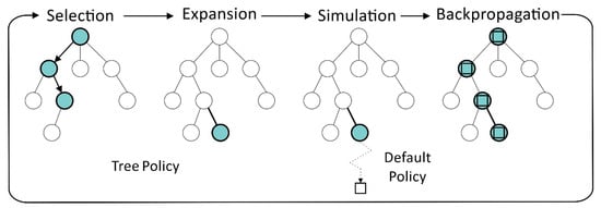 MCTS is widely used as a powerful method in games and decision-making problems. The method constructs a tree and stores information about each action through iterations, allowing for more illuminating decisions to be made in subsequent decisions. Figure 3 shows one complete iteration in MCTS.