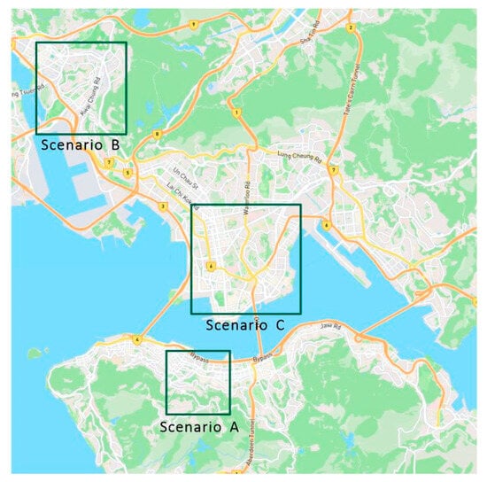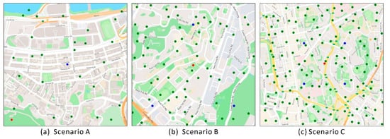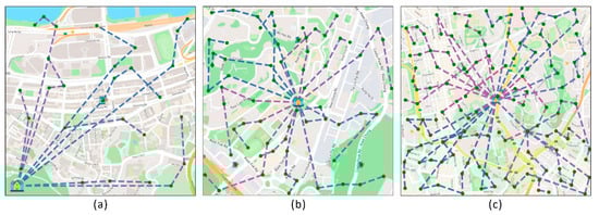 Figure 14 illustrates the task allocation of TA-MCTS in three scenarios. Figure 14a–c represent the results under scenarios A, B, and C, respectively. The dotted lines of different colors represent different task groups, and the green dots represent the task locations.