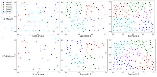 In order to verify the effectiveness of the UD-Kmeans method, this paper conducted group experiments for all tasks within the three scenarios. Based on the maximum load of UAVs and the number of UAVs, this paper determined that the number of groups in scenarios A, B, and C was 3, 4, and 5, respectively, according to Equation (9). The experimental results are shown in Figure 8 and Table 4. Figure 8 indicates the grouping results with different colored dots, and Table 4 directly shows the number of elements in each group. UD-Kmeans made the number of tasks in each grouping result consistent. However, the K-means grouping results indicate inconsistent tasks in each group. Uneven grouping results may lead to difficulties in subsequent task assignments. Therefore, UD-Kmeans contributes to the stability and reliability of subsequent multi-task allocations.