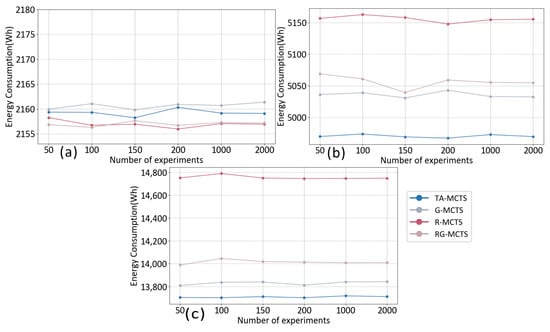 Figure 9 shows the average energy consumption of different algorithms for multiple experiments in different scenarios. Figure 9a–c represent the average energy consumption under scenarios A, B, and C, respectively. The difference between the four methods was relatively slight due to the small area covered by Scenario A. Figure 9b,c show that TA-MCTS consumed less energy on average than the other three methods, regardless of the number of experiments. Moreover, the results obtained by the TA-MCTS method were more stable, while the other three methods were subject to fluctuations.