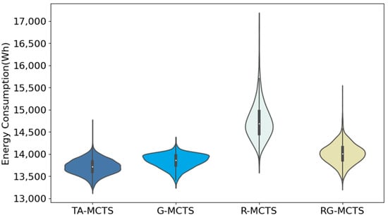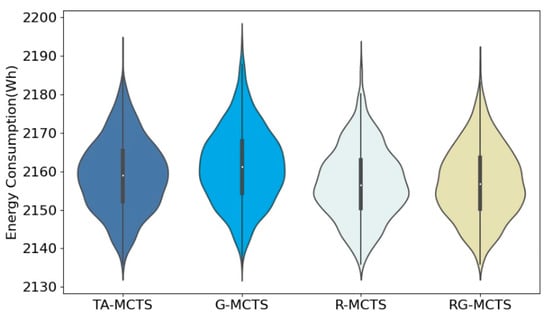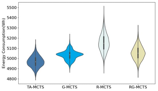 In order to show the effect of each method more clearly, this paper used violin plots to show the characteristics of the data distribution of energy consumption for 2000 experiments; the results are shown in Figure 10, Figure 11 and Figure 12. As seen in Figure 10, due to the small area of Scenario A, the UAVs carrying energy could cover almost the whole area, so the difference in the data distribution obtained by the four methods was small. Figure 11 and Figure 12 show that in Scenarios B and C, the difference in the distribution of energy consumption among the four methods was more evident due to the expansion of the area. In Scenario B, the data concentration of TA-MCTS is better than the remaining three methods. The optimal and worst energy consumption of TA-MCTS was also better than the other three methods. In Scenario C, TA-MCTS indicated significantly lower energy consumption in the concentrated area than RG-MCTS and G-MCTS. R-MCTS performed less well than the other algorithms, and the distribution of results was relatively scattered due to its intrinsic randomness.