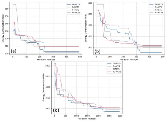 Figure 13a–c show the iterative process for a sub-task group in scenarios A, B, and C, respectively. In the three scenarios, the number of iterations required to converge was approximately the same for all four methods. However, the TA-MCTS method proposed in this paper obtained better results after a similar number of iterations, proving the superiority of the TA-MCTS method.