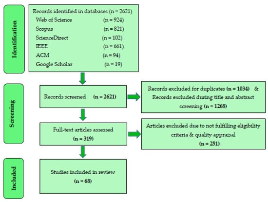 Our research follows Kitchenham’s guidelines for designing and implementing a systematic literature review [,].